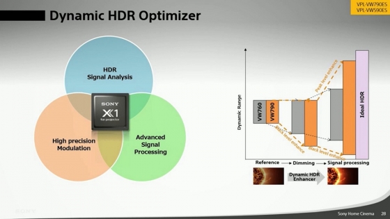 Novità anche per il nuovo modello laser VPL-VW790ES che sostituisce il vecchio VPL-VW760ES. Anche in questo caso le caratteristiche salienti, come il flusso luminoso (sempre 2.000 lumen), il rapporto di contrasto e le parti meccaniche (iris) non cambiano. Oltre all'adizione di una nuova scheda e del DSP "X1 for projectors" per la gestione dinamica dell'HDR, c'è anche una riduzione del 20% del prezzo: il 760 costava 14.990 Euro mentre il 790 costa 11.990 Euro, sempre IVA inclusa Rimane in catalogo il laser VPL-VW870ES, per alcuni aspetti ben inferiore al nuovo 790. Il vecchio 870 ha solo il 10% di lumen in più, un'ottica più grande ma con prestazioni in termini di dettaglio sovrapponibili al 760.