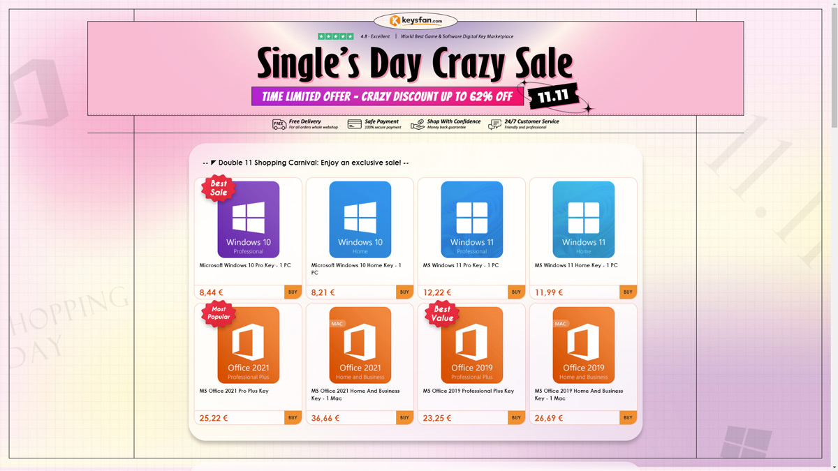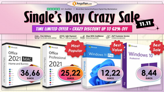 Il tanto atteso festival dello shopping Double Eleven sta arrivando! Ai nostri giorni il Singles’ Day (11 novembre) si è evoluto nel più importante festival dello shopping online in Cina e in un fenomeno di shopping globale, attirando sempre più piattaforme digitali a partecipare. Keysfan ha avviato una vendita pazzesca per il giorno dei single durante cui puoi acquistare chiavi software autentiche e sicure a una frazione del prezzo! Grazie ai Singles’ Day Crazy Sale avviati da Keysfan, Windows 11 Pro costa solo 12,22€. Non ci sono costi aggiuntivi, basta acquistarlo una volta e usarlo per tutta la vita. Questo è davvero un ottimo affare. E' possibile anche acquistare Windows 10 Pro con licenza a vita per 8,44€ da Keysfan Office 2021 Pro a 25,22€ e rientrare perfettamente nel proprio budget. Keysfan mette a disposizione chiavi software a basso costo che soddisferanno tutte le tue esigenze. I saldi pazzeschi del giorno dei single di Keysfan durano per un periodo limitato. Dovresti fare buon uso del tuo tempo!