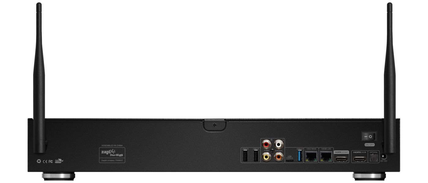 La funzione Zappiti Share permette di condividere i contenuti multimediali con fino a 4 player della casa, mentre l'app Zappiti Media Control la gestione tramite device iOS/Android. Il parco connessioni prevede terminali HDMI 2.0a in/out, uscite analogiche A/V e digitali ottiche, tre porte USB (1x3.0), slot SATA e lettore SD/MMC.