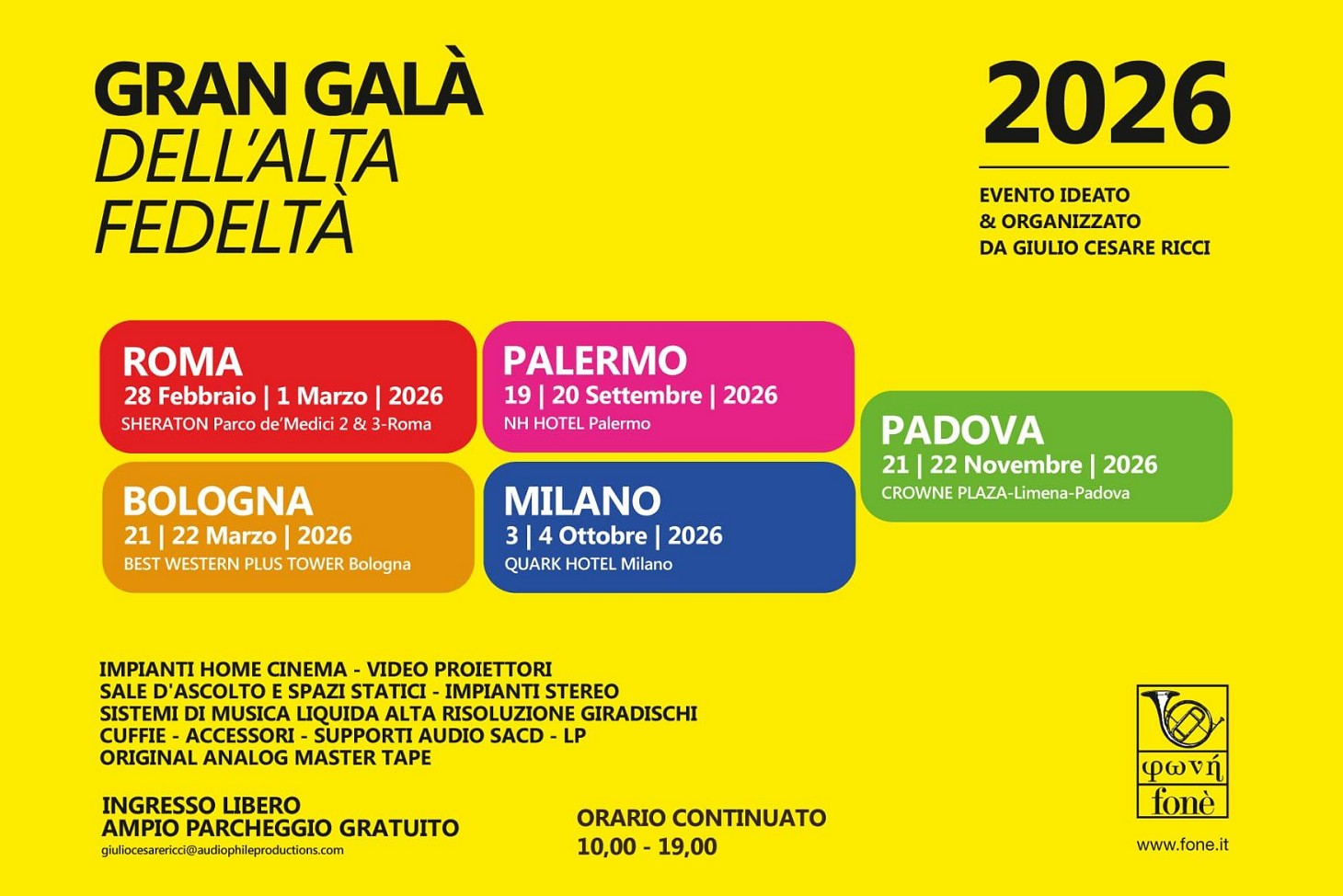 il weekend del 3 e 4 ottobre 2026 è la data scelta da Giulio Cesare Ricci per il Gran Galà dell'Alta Fedeltà di Milano che si terrà al Quark Hotel, recentemente ristrutturato.