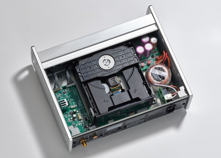 L'apparecchio beneficia anche di una funzione che disattiva l'uscita digitale inutilizzata, riducendo così il carico complessivo del circuito e il degrado del segnale. L'alimentazione è di tipo discreto con trasformatore toroidale, dotato di tripli secondari e tripli circuiti raddrizzatori. Questi alimentano separatamente circuito audio, meccanica CD e microprocessore e infine il circuito del display. Questo design contribuisce a minimizzare il rumore e incrementare la definizione del suono. L'orologio interno beneficia di un cristallo oscillatore ad alte prestazioni e basso rumore di fase, ma è disponibile anche l'ingresso BNC 10 MHz per collegare il generatore di clock esterno CG-10M-X. Sul retro, oltre alle uscite S/PDIF, ottica e coassiale, si trovano anche dei terminali trigger / 12V per l'auto on/off e una porta per gli aggiornamenti. Il cabinet, costruito interamente in metallo, ha i pannelli laterali in solido alluminio da 8 mm, dotati anche di una struttura di montaggio unica che non sottopone altre parti del cabinet a inutili sollecitazioni meccaniche, ottenendo una risonanza neutra.