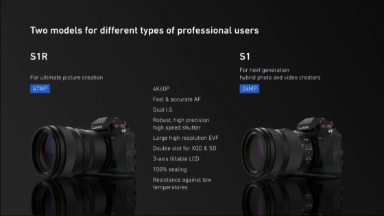Panasonic ha annunciato a Photokina 2018 la serie Lumix S, una nuova gamma di fotocamere mirrorless full frame, che sarà disponibile a livello mondiale dalla primavera 2019. A comporla saranno i modelli Lumix S1R e Lumix S1, compatibili entrambi con l'attacco L-Mount per utilizzare le lenti intercambiabili dei partner Leica e Sigma. Le Lumix S saranno le prime mirrorless full-frame a obiettivo singolo capaci di girare video in 4K/50-60 fps, nonché dotate di uno stabilizzatore Dual I.S. per foto nitide a campo lungo o in condizioni di penombra senza utilizzare treppiedi. L'elaborazione sarà affidata ad un nuovo processore Venus Engine. Il sensore ha una risoluzione di circa 47MP nella Lumix S1R e 24MP nella Lumix S1.