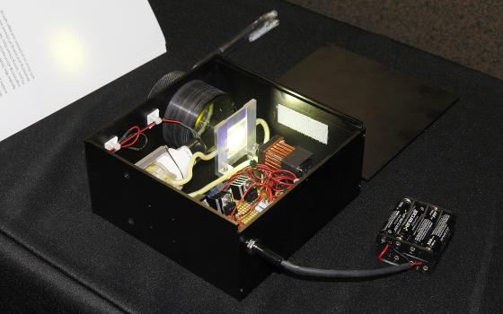 Il laser "blu" irradia il suo fascio verso una placca trasparente, entro la quale scorrono i fosfori in fase liquida. Il piccolo prototipo è alimentato da 8 pile AAA ed include solo un mix di fosfori giallo-verde. Ken Li precisa anche che è possibile immaginare un futuro con cartucce ricaricabili, in modo da rinnovare ciclicamente i fosfori invecchiati.