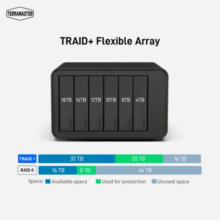 TRAID+ è l'ultima versione dello strumento, integrato nel sistema operativo TOS 6, per la gestione dell'array di dischi nei NAS TerraMaster. TRAID, abbreviazione di TerraMaster RAID, offre funzionalità come la combinazione automatica dello spazio su disco, la protezione con ridondanza dai guasti degli Hard Disk e l'espansione automatica della capacità. Queste operazioni non richiedono una configurazione manuale, ma vengono eseguite automaticamente dal sistema. Con l'introduzione di TRAID+ la protezione viene estesa a due dischi, mentre TRAID garantisce la ridondanza per uno solo. La struttura operativa di TRAID+ rispecchia quella di RAID 6, suddividendo lo spazio sul disco in diverse unità di archiviazione e utilizzandone le caratteristiche per ottenere una configurazione di array versatile. Questo approccio garantisce l'affidabilità dei dati e un'eccezionale efficienza di archiviazione. La creazione di un array TRAID+ tuttavia richiede un minimo di quattro dischi e inoltre, durante la migrazione da TRAID a TRAID+, i dischi aggiunti devono avere una capacità uguale o superiore a quella del disco più piccolo dell'array TRAID originale.