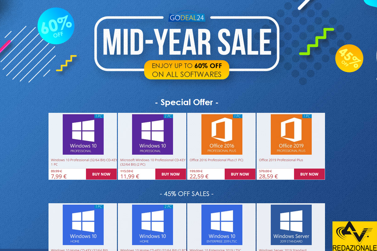 Nuove offerte super vantaggiose di Godeal24 sulle licenze per software microsoft come Windows 10 Professional a 7,99 euro e il pacchetto Microsoft Office 2019 a 28,59 euro e molto altro in occasione della vendita di metà anno
