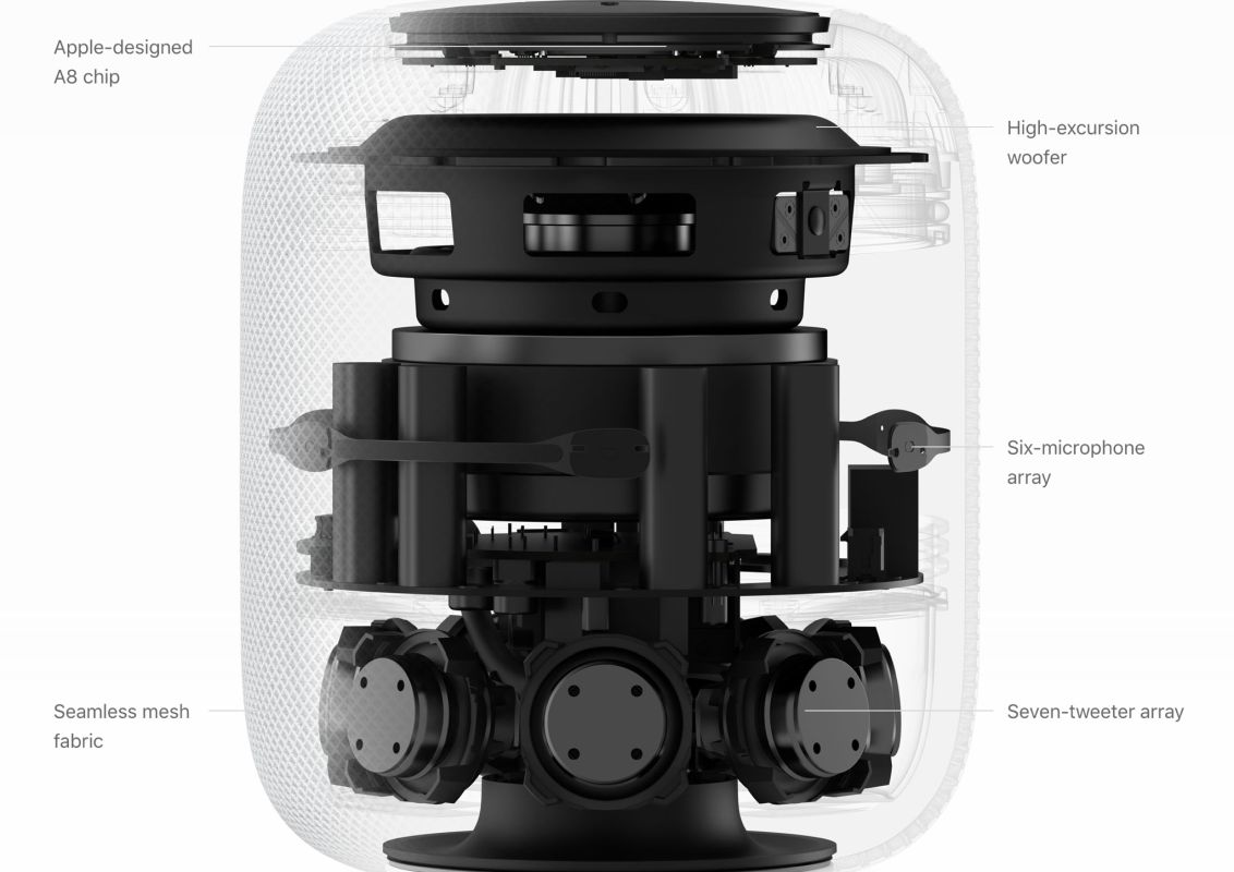 Durante la conferenza WWDC, Apple ha presentato HomePod uno speaker senza fili con assistente vocale Siri. Alto circa 18 cm, il cabinet cilindrico è ricoperto da un tessuto acusticamente trasparente. Intorno alla zona inferiore sono posizionati sette tweeter a tromba, mentre i medio-bassi sono riprodotti da un driver da 10cm orientato in alto. Ogni trasduttore dispone di uno stadio di amplificazione indipendente. Lo speaker è dotato di equalizzazione automatica dei bassi, modalità "direct"/"ambient" e di un sistema di compensazione della risposta in base al posizionamento in ambiente.