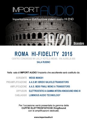 Il prossimo Roma Hi-Fidelity, in programma sabato 19 e domenica 20 dicembre presso l'Hotel NH Midas, offrirà un ulteriore occasione per ascoltare i diffusori elettrostatici Kingsound King III. Lo stand Import Audio, presso la sala Rubino, vedrà inoltre la presentazione della gamma di cuffie elettrostatiche della stessa marca, abbinate ai rispettivi amplificatori.