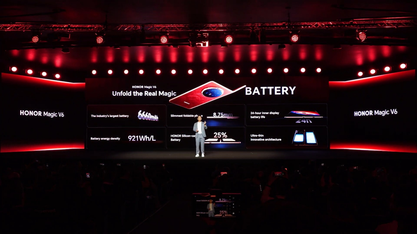 Quello più evidente e l'aumento di capacità della batteria che fa 5.820mAh passa a ben 6.600mAh. Sul palco della presentazione al Mobile World Congress 2026, Honor ha voluto rimarcare i dati di autonomia del nuovo pieghevole, mettendolo a confronto con diversi prodotti Apple. A livello di prestazioni lo smartphone fa leva sul SoC Qualcomm Snapdragon 8 Elite Gen 5, supportata da 16GB di RAM e storage da 512GB.