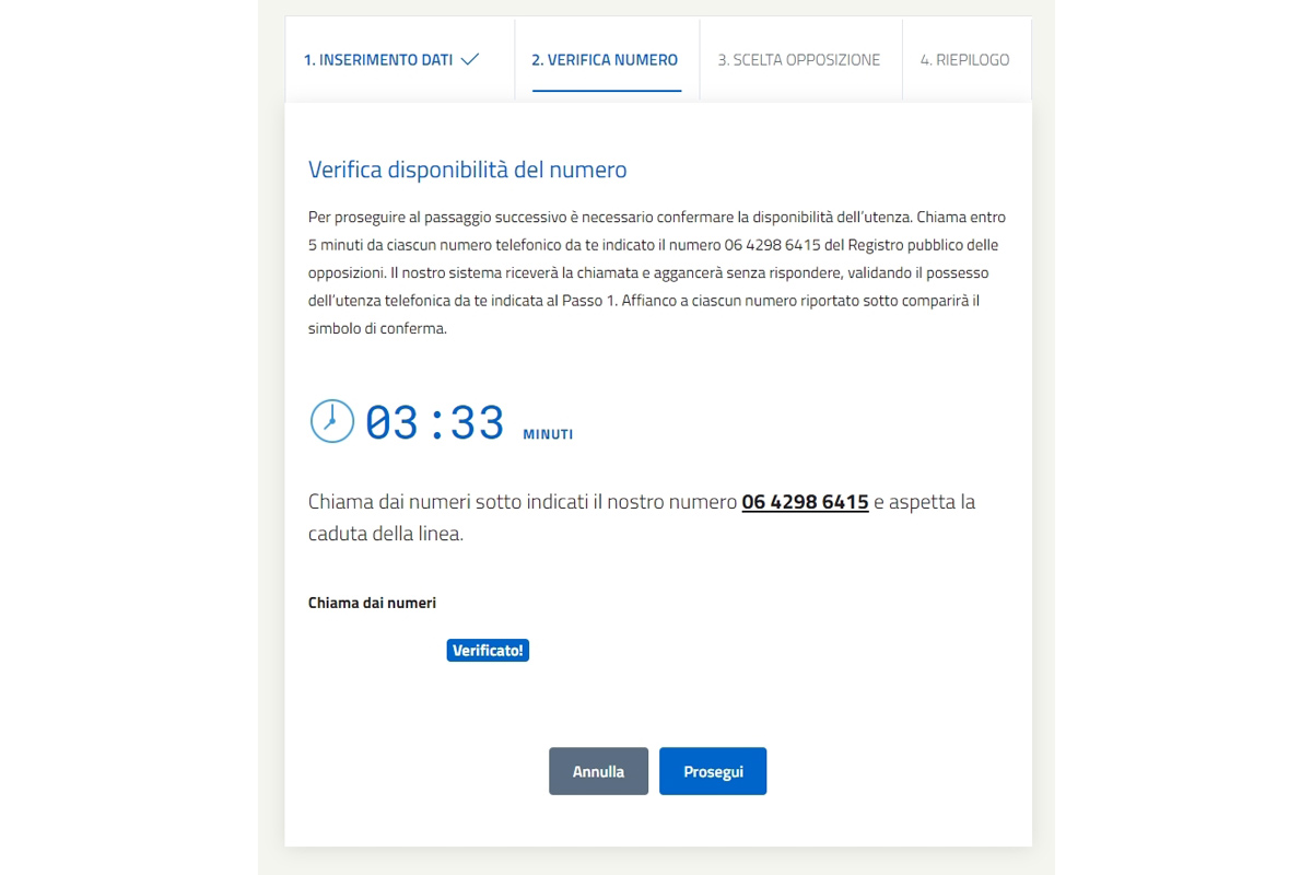 Oppure si può chiamare dal numero che si intende iscrivere il numero verde 800 957 766 in caso di utenze fisse o il numero 06 42986411 in caso di cellulari, seguendo le istruzioni del risponditore automatico per esprimere il diritto di opposizione. In caso di difficoltà la chiamata verrà inoltrata a un operatore umano.