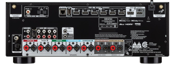 Denon ha annunciato il sintoamplificatore A/V AVR-S980H, un modello 7.2 canali con decodifica Dolby Atmos e DTS:X. La potenza dichiarata è di 90W (8 ohm, 20÷20k Hz, THD 0.08%, 2 canali pilotati). Il costruttore garantisce che oltre il 70% della potenza viene erogato costantemente su fino a cinque canali. La piattaforma multiroom HEOS permette l'accesso, tramite Ethernet/Wi-Fi, alle radio internet e a servizi streaming come Amazon Music HD, Deezer e TIDAL, comprese le selezioni di brani Hi-Res Audio. Sono a disposizione anche le tecnologie Bluetooth, Apple AirPlay 2 e Spotify Connect. Tra i connettori figurano sei ingressi e due uscite HDMI. Tre degli ingressi hanno un ampiezza di banda sufficiente per il video 8K/60p e 4K/120p, mentre una delle uscite è compatibile ARC/eARC. È prevista anche la conversione in 8K da segnali 4K e il pass-through dei formati HDR Dolby Vision, HDR10+ e HLG.