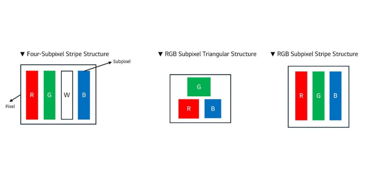 I Tandem OLED invece generano direttamente il rosso (R), verde (G) e blu (B) senza l'uso di filtri colore. L'architettura LG Display con quarto sub-pixel bianco, usato per aumentare il picco di luminanza, presenta controindicazioni come quella di ridurre la nitidezza, con il risultato di una leggera sfocatura del testo. I sub-pixel inoltre sono disposti tutti sulla stessa linea, ma secondo l'ordine RWBG (rosso-bianco-blu-verde), causando il "color fringing", ovvero bordi scoloriti attorno alle aree ad alto contrasto dei testi e delle immagini. Il problema è stato parzialmente risolto nel 2024 passando, almeno in alcuni modelli, alla disposizione RGWB (rosso-verde-bianco-blu). I QD-OLED di Samsung Display hanno un layout RGB, ma sono anch'essi affetti dal color fringing, perché i sub-pixel sono disposti a triangolo. Il difetto comunque dovrebbe essere stato risolto con i nuovi pannelli V-Stripe. TCL CSOT da parte sua ha iniziato la costruzione di un impianto per produrre OLED con sub-pixel RGB allineati. Gli OLED per monitor con layout RGB erano già inclusi, come un potenziale sviluppo tecnologico, nella roadmap dei monitor LG Display per il biennio 2024-2025.