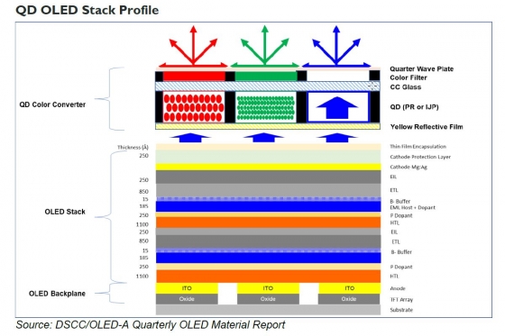 Si può supporre che il riferimento sia una schermata al 100%, dato che i pannelli OLED LG più recenti raggiungono un picco di almeno 650-750 NIT. Una differenza importante è che Samsung sembra sia riuscita ad eliminare i filtri colore e il polarizzatore circolare dei prototipi precedenti, riuscendo quindi ad ottenere una conversione completa della luce prodotta dagli OLED. Nella struttura è stato inserito uno strato antiriflesso proprietario che riduce la riflessione a meno dell'1%, mentre quella degli OLED WRGB è del 4%. La compagnia coreana sostiene che il programma di sviluppo non ha subito ritardi e quindi di attendersi l'avvio della produzione nel 2021.