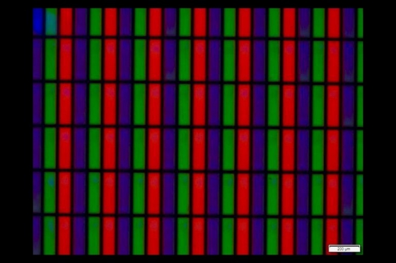 La fotografia sopra si riferisce a una matrice CFR (Color Filter Replacement) stampata a getto d'inchiostro di circa 300 × 300 micron, che equivale approssimativamente alla densità di pixel di un TV UHD da 50 ". I subpixel blu sono essenzialmente trasparenti, consentendo alla luce della retroilluminazione a LED di passare liberamente. I progressi nella tecnologia ink-jet avranno anche l'effetto di abbreviare i tempi di sviluppo dei display Quantum Dots elettro-emissivi.
