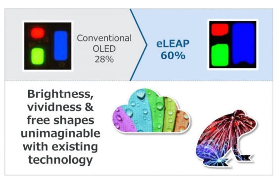 L'acronimo eLEAP sta per environment positive, Lithography with maskless deposition, Extreme long life, low power and high luminance, Any shape Patterning. La tecnologia eLEAP può essere applicata nella produzione di OLED per dispositivi indossabili fino ai televisori grande schermo, adattandosi a substrati di 8ª generazione (2200x2500 mm) e oltre. JDI ha dichiarato inoltre che il metodo eLEAP si può abbinare ai backplane con tecnologia proprietaria HMO (High Mobility Oxide). Ulteriori vantaggi sono i minori costi operativi e scarti di lavorazione, eliminando tra l'altro i liquidi per la pulizia delle maschere FMM. Gli OLED eLEAP promettono quindi una riduzione significativa dei materiali usati per la produzione e delle emissioni di CO2. Eliminando le FMM, è possibile inoltre la deposizione dei materiali secondo qualsiasi schema.