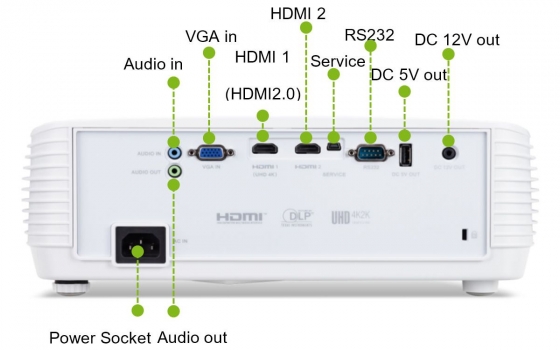 L'engine ottico dispone delle tecnologie Acer ColorPurity e ColorBoost II. Si basa su una lampada UHP da 240W, accreditata di una longevità di 4000/10000 ore in modalità Standard/Economy. La rumorosità è invece contenuta in 21/24/30 dB (Quiet/Economy/Standard Mode). L'audio è riprodotto da uno speaker alimentato da un ampli con potenza massima da 10W, mentre due sono gli ingressi HDMI 2.0 con HDCP 2.2. L'accessorio opzionale Acer Wirelesscast ne permette l'uso senza fili.